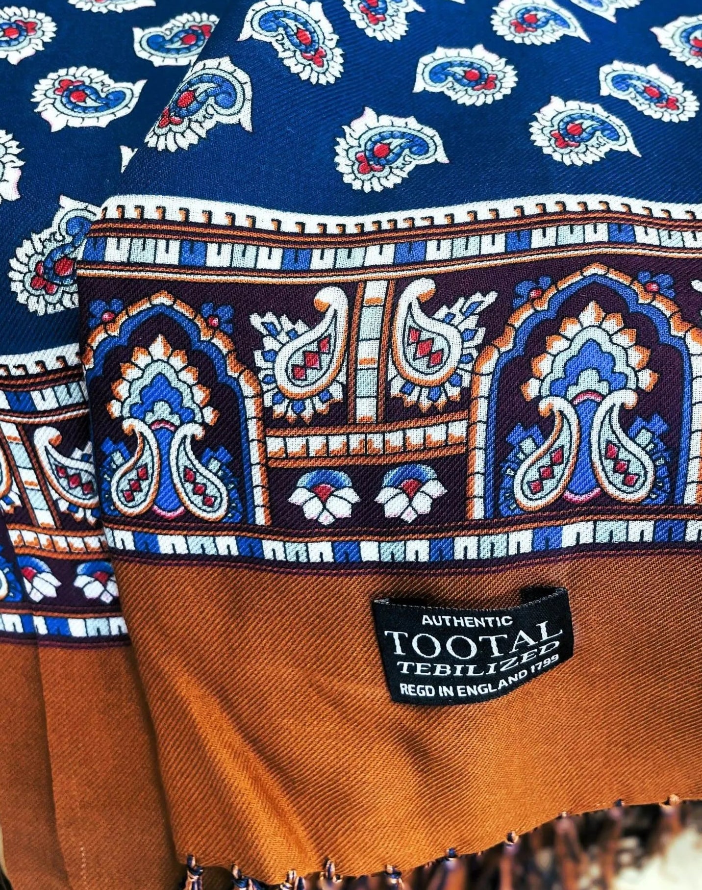 Tootal Navy Paisley with Gold Border Rayon Scarf with Fringe